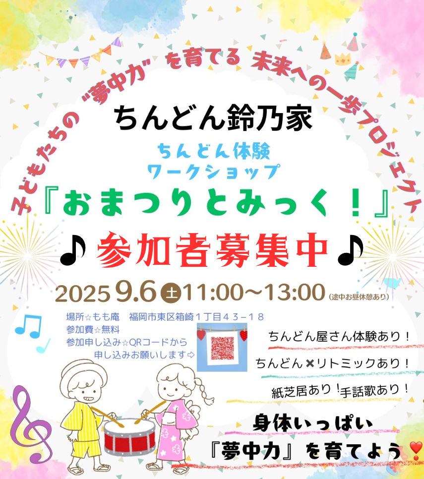 ちんどん体験ワークショップ 2025年9月6日 ちんどん体験ワークショップ お申し込みはこちらへ おまつりとみっく! 杜の宮ギャラリーもも庵 もも庵♪ 杜の宮ギャラリーもも庵福岡県福岡市東区箱崎1-43-18-2F(印房小山田2階)場所を表示 杜の宮ギャラリーもも庵福岡県福岡市東区箱崎1-43-18-2F(印房小山田2階)場所を表示マップ 杜の宮ギャラリーもも庵 Google カレンダー カレンダーに戻る