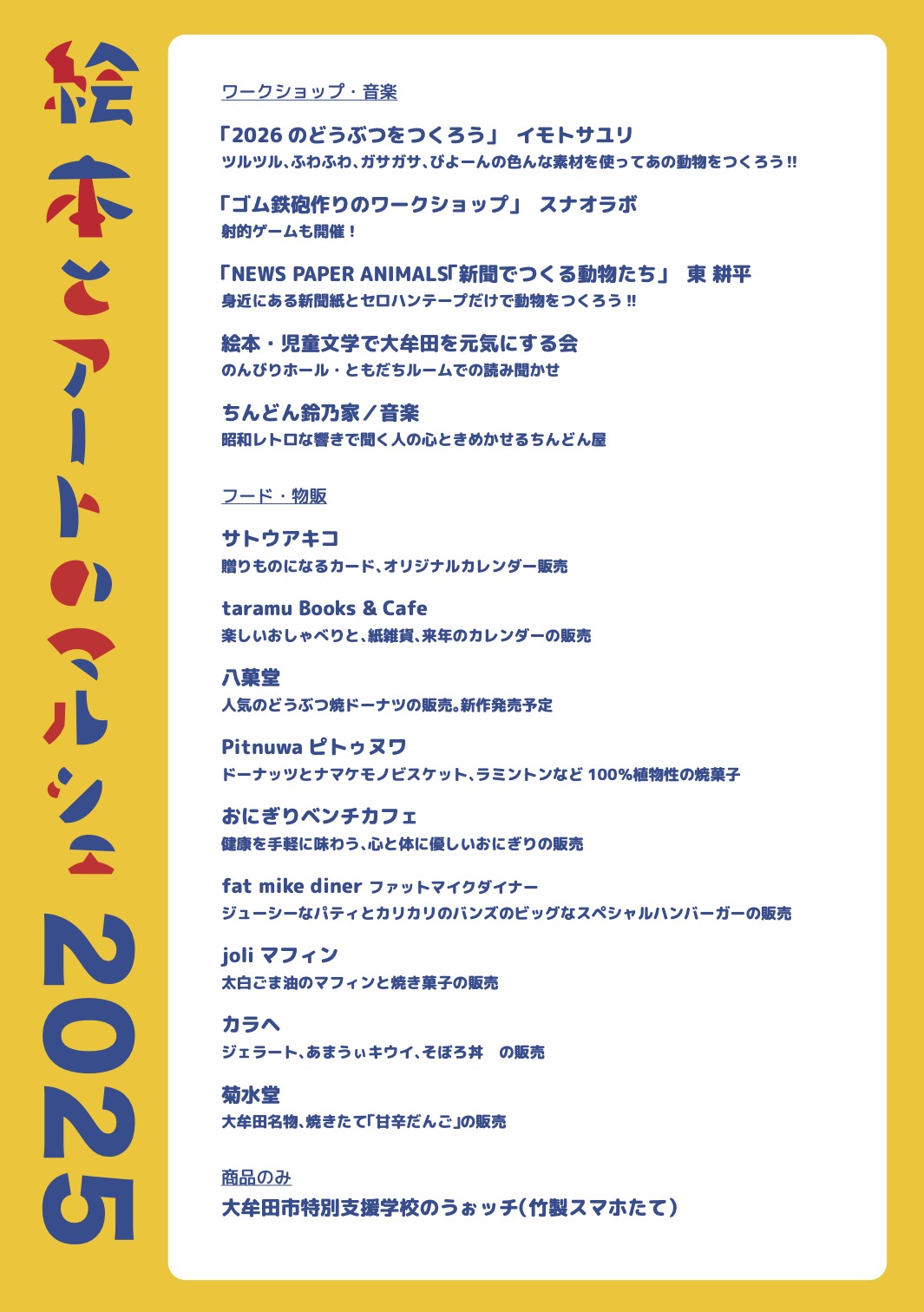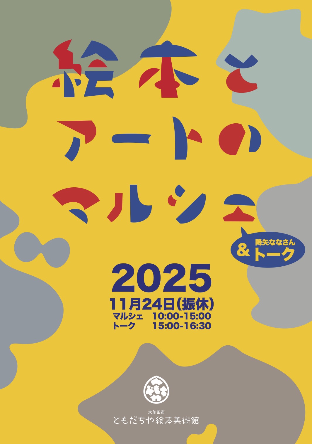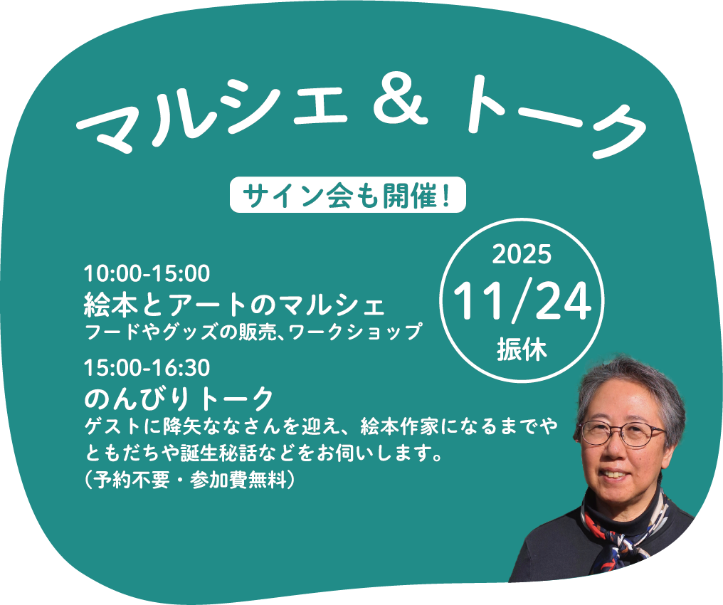 イベント詳細Event カテゴリー: ちんどん鈴乃家 絵本とアートのマルシェ 絵本とアートのマルシェ 2025年11月24日 Google カレンダーに戻る 城下のMACHIBITO 2025年11月22日 第1回ラボラボマルシェ2025 2025年11月30日
